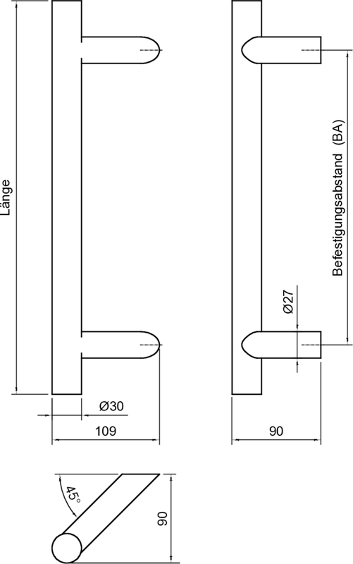 HOPPE Stangengriff E5012 Stützen 45° m. Bef. 11 BA=300, l=400, d=30, Edelstahl matt (F69)