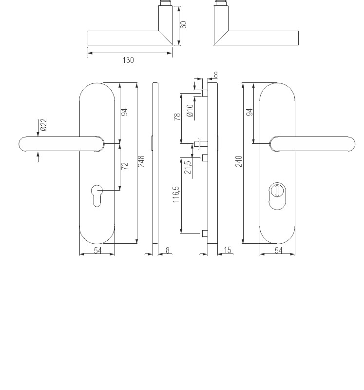 Die greenteQ Schutz-Drückergarnitur Q DG61.S216.ZA72.AL.R9016.N54.ES1 aus Aluminium hat eine Schildbreite von 54 mm und ist PZ-gelocht, die Drücker sind lose gelagert. Als spezielle Schutzvorrichtung gegen Aufbohren ist im Außenschild eine Zylinderabdeckung integriert, für eine vorstehende Zylinderlänge von 9 - 14 mm. Die greenteQ Schutz-Drückergarnitur Q DG61.S216.ZA72.AL.R9016.N54.ES1 ist für 8 mm Vierkantstift und 72 mm Entfernung vorgerichtet und hat 10 mm Stütznocken. Die Befestigung erfolgt mittels verdeckter Verschraubung mit dem mitgelieferten Befestigungs-Set (3 Gewindeschrauben M6 mit Gewindestopp und 1 Vierkantstift 8 mm). Weitere Befestigungs-Sets für abweichende Türstärken sind verfügbar.