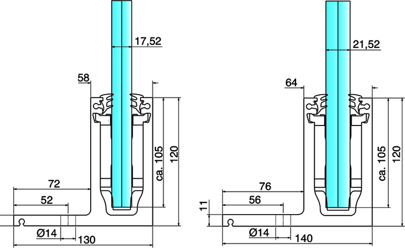 Systemprofilset CP-1400, 5000 mm f.Glas 21,52 mm,Aluminium,Edelstahloptik